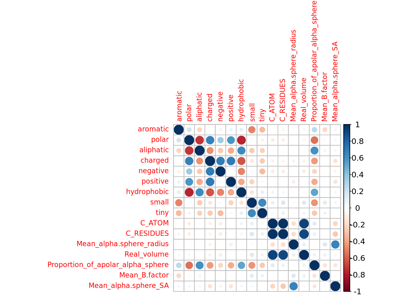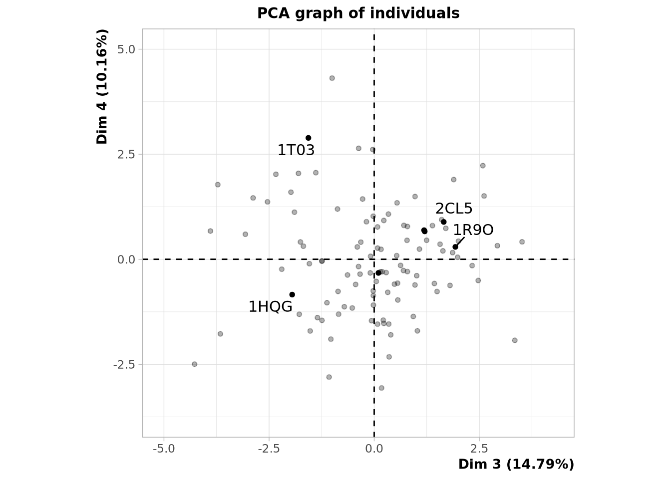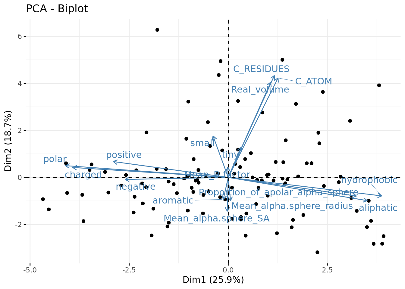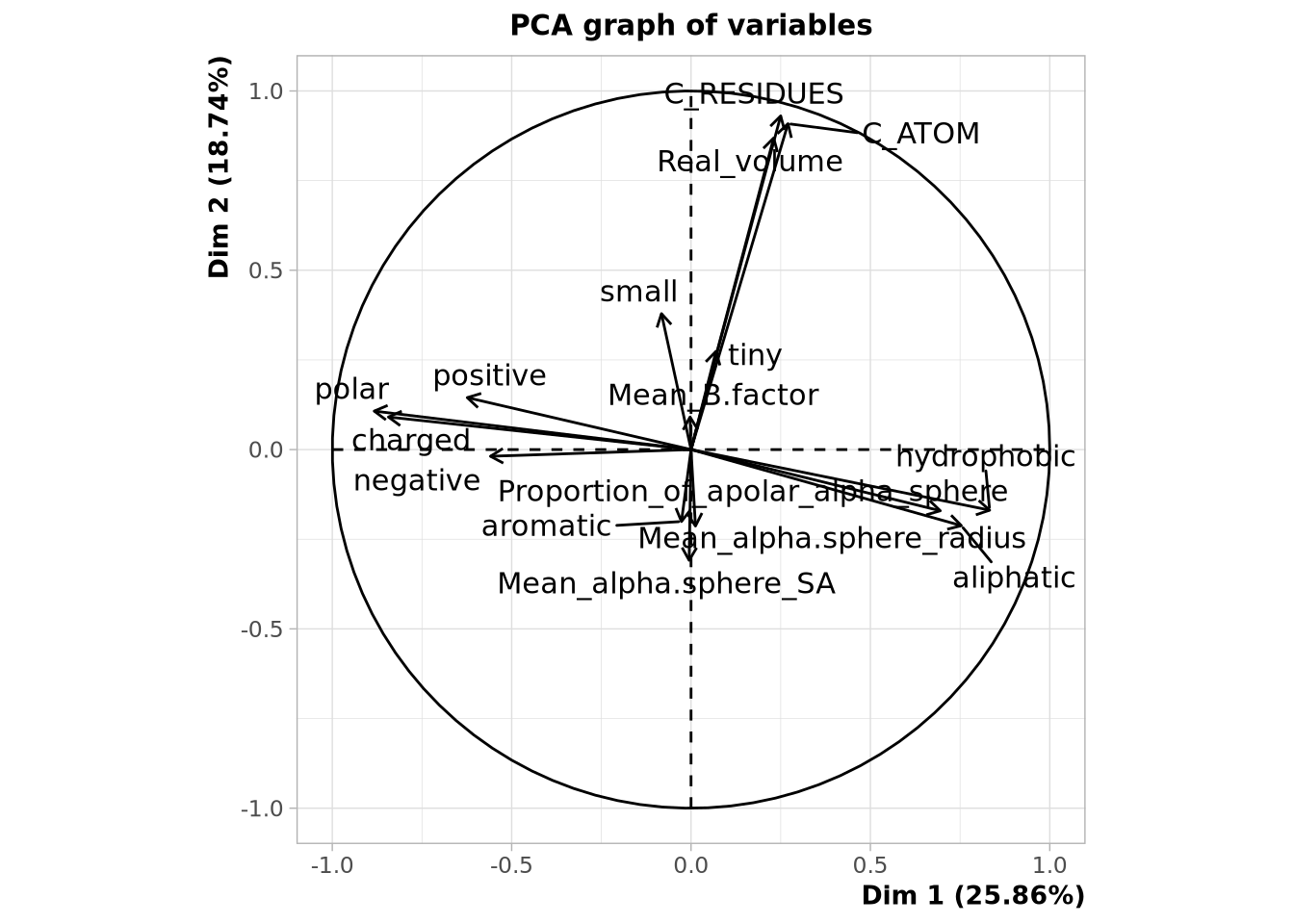 Sur ce plan, nous avons 44,6% de variabilité ce qui implique que toute la variance du jeu de données n’est pas expliquée par ces deux vecteurs propres. Nous voyons qu’il y bien des variables mieux représentées que d’autres, elles correspondent à celles s’éloignant le plus de centre du graphe (ex: C_ATOM, polar, aliphatic) Les variables corrélées sont celles situées dans les mêmes régions par rapport à un axe et les anti-corrélées sont celles dans les régions opposées par rapport à un axe. Les variables “indépendantes” sont celles n’étant pas expliquées par les deux axes. Nous n’avons pas d’information sur elles et ne peuvent donc pas être comparées aux autres. Nous avons donc un premier axe qui caractérise la polarité
